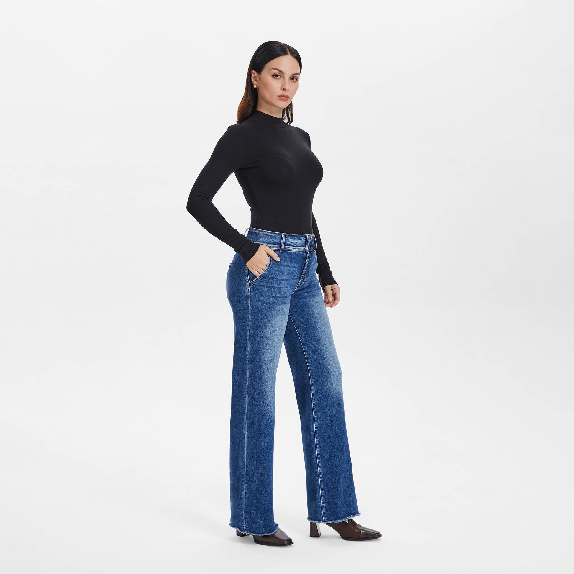 CRAFTED FROM COMFORT STRETCH DENIM DARK BLUE FOUR POCKETS, DOUBLE TUBE BACK POCKETS, HIGH RISE WAIST, ZIPPER FLY, DART DESIGN, NATURAL WASHING EFFECT, RAW HEM, DENIM JEANS