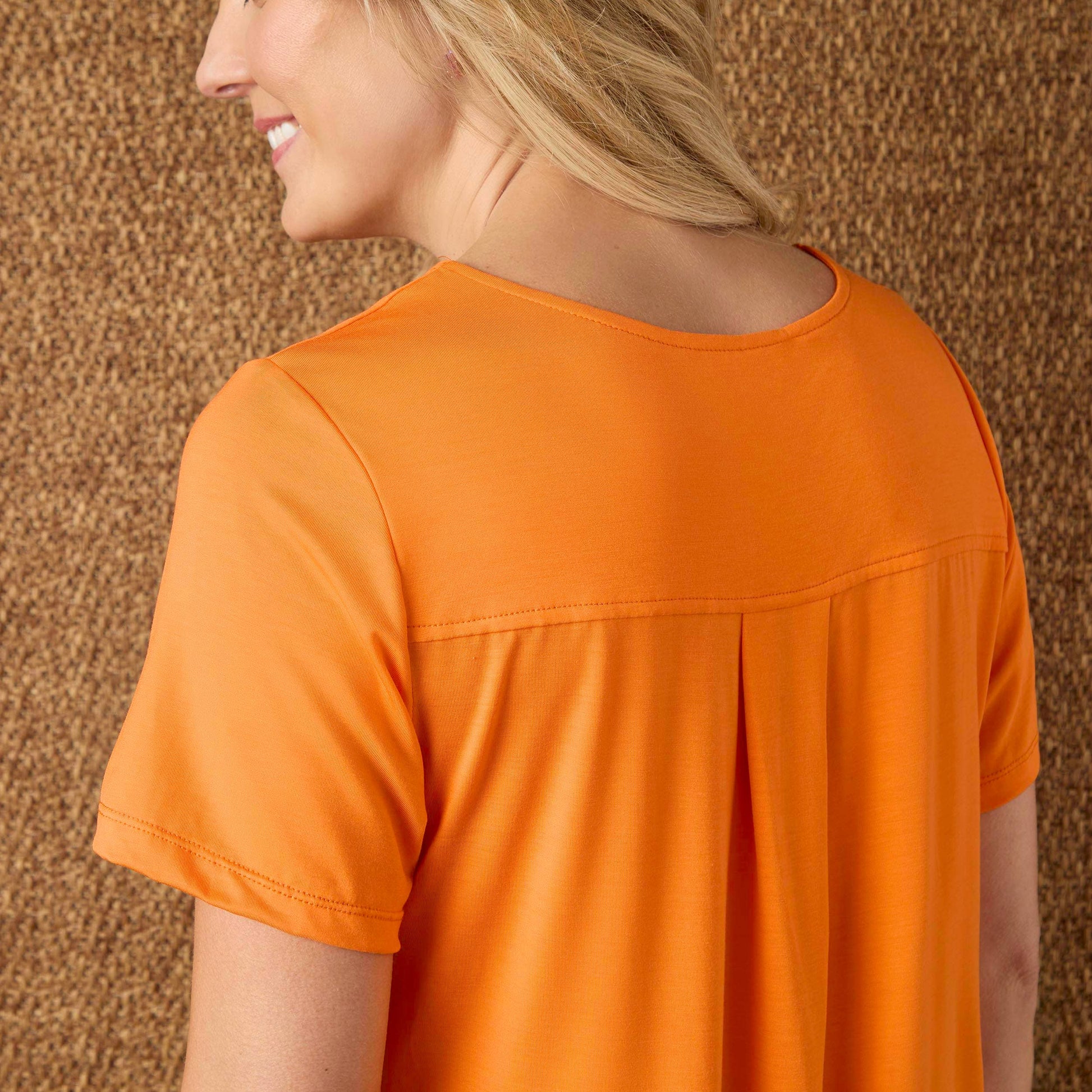 The Erin Pleat Back Tee is a must-have addition to your wardrobe! With its short sleeves and lightweight fabric, it's perfect for staying cool and comfortable all day long. Its unique pleat back design adds a touch of elegance, while the curved hem creates a flattering fit. Available in various colors, this tee is versatile enough to be dressed up or down for any occasion. Whether you're heading to the office or enjoying a casual outing with friends, this tee will become your go-to choice! Materials: Rayon/Spandex