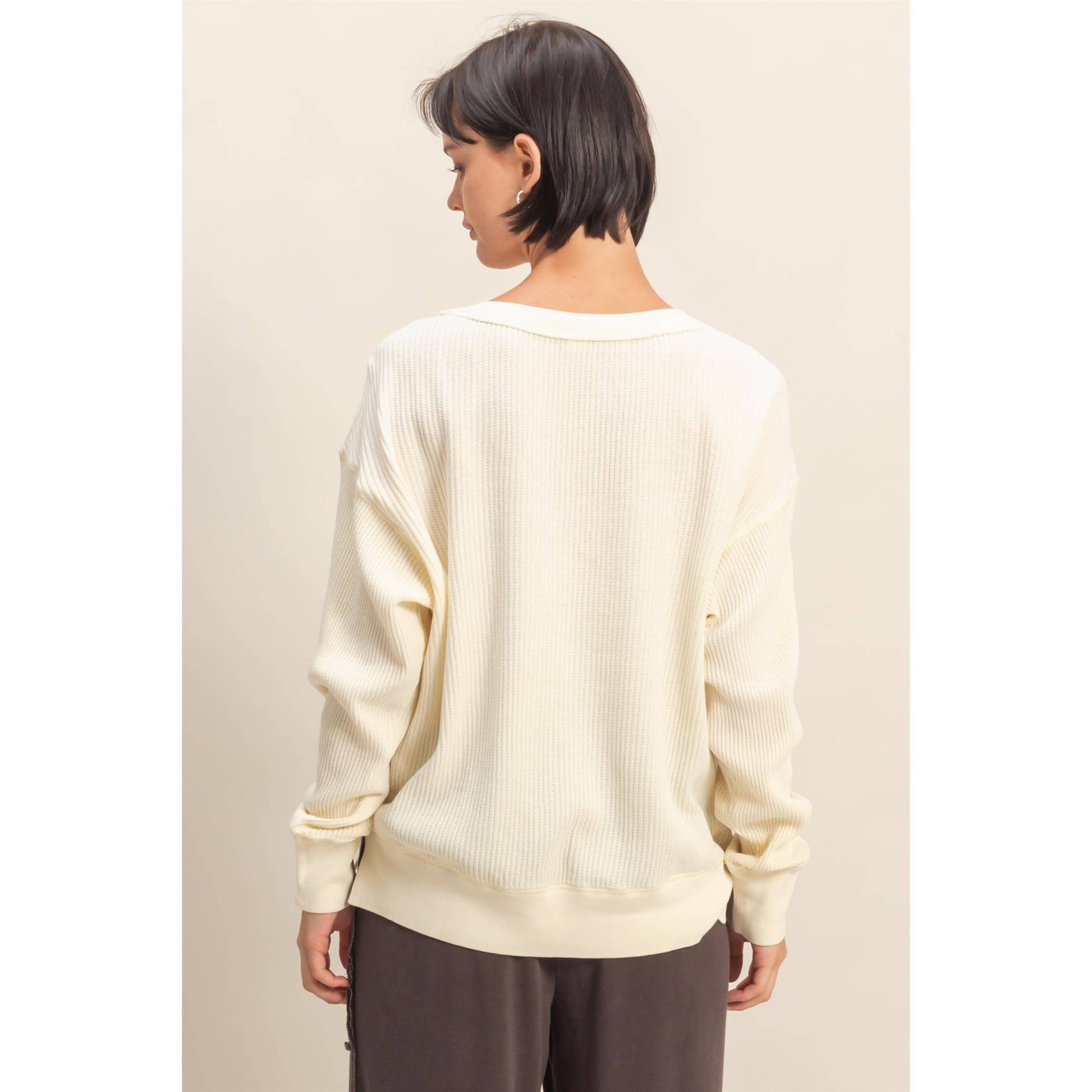 HYFVE - Scoop Neck Waffle Mineral Washed Long Sleeve Top in CREAM